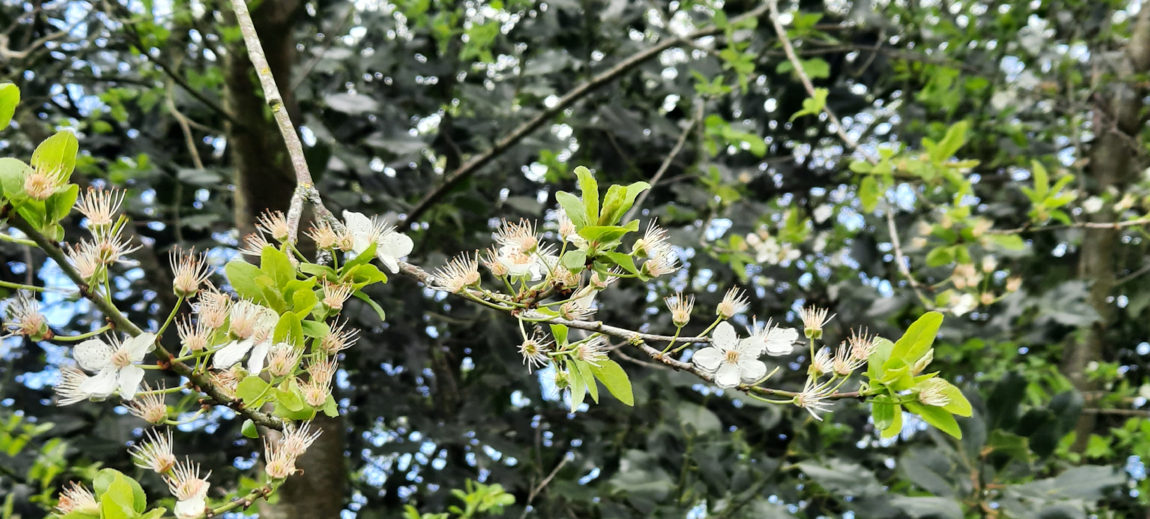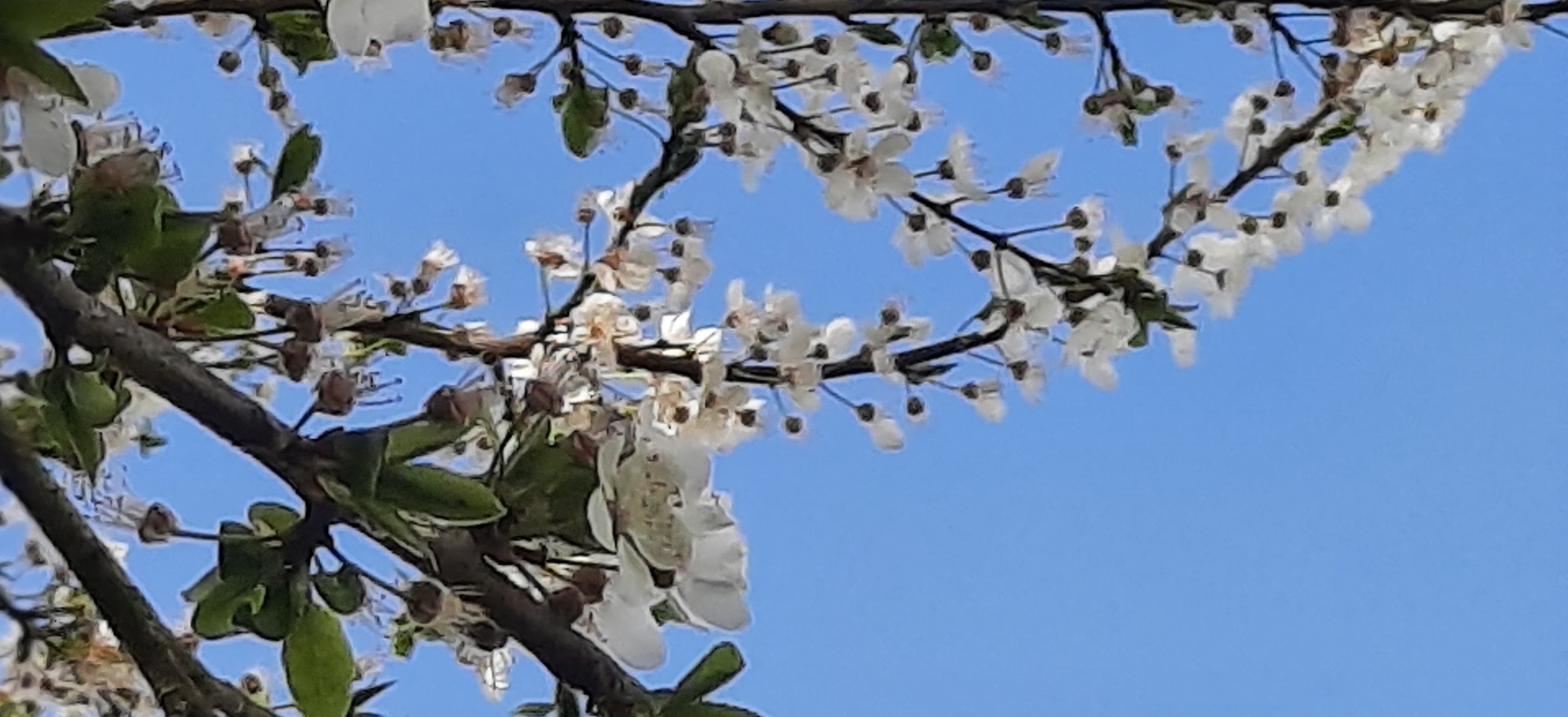 De Mirabel verliest haar bloemblaadjes. Wekenlang vormde de boom een vrolijke witte wolk tussen de kale winterse takken van het bosje. Nu dwarrelen er witte stipjes naar beneden. Even een gevoel van weemoed: zo snel gaat de tijd voorbij. Het voelt als een gaatje in je hart.