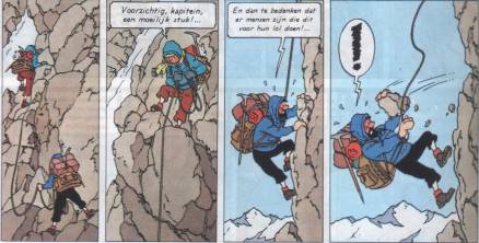 wel? Dit is een fragment uit het juryrapport over Vallen. Ben je het met de jury eens dat het boek over onbeslistheid gaat? Of vind je dat een wonderlijke conclusie? Wat zie je zelf als belangrijkste thema van het boek? Kom met argumenten! Over het juryrapport van de Woutertje Pieterse Prijs IIVan begin af aan vertoont Vallen de trekken van een klassiek noodlot; traag, maar onontkoombaar, gaat het op het huiveringwekkende slot aan. Volgens de jury zijn de trekken van een klassiek noodlot: op een trage maar onontkoombare manier naar een huiveringwekkend slot toewerken. Ben je het daarmee eens? En gelden die kenmerken ook voor Vallen? Is dat slot nog wel huiveringwekkend als het in het eerste hoofdstuk al verklapt wordt? Hoe dwingend, hoe onontkoombaar rijgen de gebeurtenissen zich aaneen? Over overeenkomsten en verschillen tussen Vallen en WinterijsEen andere jeugdroman die de Woutertje Pieterse Prijs heeft gekregen is Winterijs van Peter van Gestel. Dat boek is ook verschenen in de Schatkist-reeks. Klik hier voor meer informatie over dat boek.Voor lezers van beide jeugdromans kan het boeiend zijn om ze met elkaar te vergelijken. In beide boeken is er sprake van het verzwijgen van wat er in de Tweede Wereldoorlog met de joden gebeurd is. En in beide boeken komt de hoofdpersoon langzaam maar zeker achter de waarheid. Ook de structuur van de romans kent een opvallende overeenkomst: één grote flashback, geschreven in de verleden tijd, ingeklemd tussen twee korte fragmenten die zich een aantal maanden later afspelen en zijn geschreven in de tegenwoordige tijd. Zelfs de weersomstandigheden spelen in beide boeken een vergelijkbare rol. In Vallen is dat een broeierig hete zomer, in Winterijs een extreem koude winter. Zo zijn er nog meer overeenkomsten. En uiteraard ook veel verschillen. Voor liefhebbers een kluif om uit te zoeken en er met elkaar over te praten. > Doen terug naar bovenCliffhangers zoekenAls bij een vergissing komt er een zwerm duiven aangewaaid die meters achter haar hobbelig neerstrijkt. Ze neemt onder elke arm een kruk en plaatst haar benen een beetje uit elkaar. Nu zie ik duidelijk dat haar linkervoet weg is. (p. 7) Dit zijn de laatste zinnen van het eerste hoofdstuk. Met het gegeven van die ontbrekende linkervoet eindigt het hoofdstuk zo onverwacht en spannend dat je meteen door wil lezen. Zo’n eindzin van een hoofdstuk heet een cliffhanger. (Letterlijk een klifhanger: alsof iemand aan de rotsen boven een afgrond hangt. Dit is treffend verbeeld in Kuifje in Tibet van Hergé, op het laatste plaatje van pagina 39, waar kapitein Haddock aan een klif hangt en op het punt staat naar beneden te vallen: