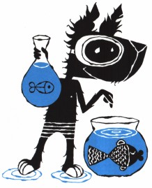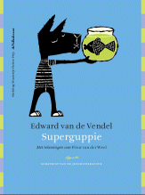 ![]() door Lieke van Duin en Jos van HestSuperguppieEdward van de Vendel & Fleur van der Weel, 2003> Boek terug naar bovenTerecht zijn Edward van de Vendel en Fleur van der Weel sámen bekroond voor Superguppie: het boek is, in de originele versie met de soepele kaft, een perfecte eenheid van tekst, beeld en vormgeving. Het is zon zeldzaam bundeltje gedichten voor kinderen waar, als je het in de hand neemt, alles aan klopt: de gedichten van Edward van de Vendel zijn origineel en toegankelijk; de tekeningen van Fleur van der Weel grappig en levendig; de ene steunkleur, lichtgroen, is inventief gebruikt; de compositie van de dubbele paginas is in evenwicht, inclusief de plaatsing van de tekst; belettering en illustraties zijn op elkaar afgestemd en de omslag vormt een smakelijk voorproefje voor het binnenwerk. Voor de versie in deze Schatkist-reeks geldt dit ook, met uitzondering van de omslag. Die heeft, evenals de andere delen, een harde kaft met de uniforme belettering van de serie. De gedichten verrassen door hun onbevangen kijk op de wereld en de onverwachte wendingen, waardoor gewone dagelijkse dingen bijzonder worden: Er lag een merel / neergevouwen / dood op het station. Neergevouwen, alsof iemand de vleugels netjes heeft geschikt. Een tuintje wordt niet geharkt en gewied, maar opgetut: We tutten ons tuintje op / en kammen het gras, / make-uppen de randjes / langs het terras:/ overal plantjes met lippenstiftkleuren. Een dekbed is een envelop waarin de ik-figuur verstuurd wordt: Mama stuurt me s avonds op / in mijn dekbedenvelop. / Nachtpost, zegt ze,/. Als de pleister van je knie af moet, doet dat pijn, maar niet de ik-figuur huilt, maar Pleistertjes krijsen zo zielig / van au. En de brievenbus is een bek waar eten in gestopt wordt: het nieuws. / Papieren eten. Zelfs het gasfornuis is niet te banaal om met een poëtische blik te worden beschreven: Luister, / luister, / luister: / ontploffend gasgefluister. Soms wordt het gewone zelfs bizar: de zweetdruppeltjes in opas wenkbrauwen zijn dan druppeltjesbiggen / om in stro te gaan liggen. En soms herinnert een regel aan een ander gedicht: De zon schijnt alle grote mensen plat / ze liggen slap als plantjes doet onwillekeurig denken aan het bekende gedicht over de sla-plantjes in september van Rutger Kopland. De laatste regels van het titelgedicht zijn een knipoog naar Hamlet: Superguppie in mijn kom, / Er nog zijn - / daar gaat het om. Fleur van der Weel maakte eigenzinnige beelden bij de gedichten: de ik-figuur is een eigenwijs hondje met een grote kop en rafelige oren. Haar prenten geven geestig commentaar op- of een onverwachte interpretatie aan de tekst of voegen er iets aan toe dat niet in de tekst staat. Zo tekent ze in het gedicht Slaap, waarin de ik-figuur in bed ligt, terwijl er beneden feest gevierd wordt, een stoet feestende muizen onder het bed. Telefoon begint zo: Als je belt, / trek je een lijntje. Bij dit gedicht tekent ze het touwtje-met-blikje-als-hoorn waarmee kinderen telefoontje spelen, en laat de ik-figuur verstrikt raken in het touw, het lijntje. Op deze manier vertelt ze met haar tekeningen een eigen subverhaal, waardoor het geheel van tekst en beeld meer is dan de som der delen. > Leeftijd en (voor-)lezen terug naar bovenDit poëzie-prentenboekje is geschikt voor kinderen vanaf zes jaar en laat zich eenvoudig voorlezen. Lees bij voorkeur één gedicht per keer voor, of hooguit een paar. Het zijn bij uitstek gedichten om te horen met je oren; wie ze alleen leest met de ogen, mist de muzikaliteit van klank en ritme. Daarom is het ook goed om hetzelfde gedicht een aantal keren achter elkaar voor te lezen. > Groepsgesprek terug naar bovenEen goede manier om een kinderboek als geheel in de klas te bespreken is ontwikkeld door Aidan Chambers. Chambers is een Engelse kinderboekenschrijver die in 2002 de Hans Christian Andersenprijs kreeg. Maar hij is ook specialist in leesbevordering en hij beschrijft deze aanpak, ontstaan in de praktijk van de basisschool, in zijn boeken Vertel eens en De leesomgeving (Biblion 2001). De werkwijze is te gebruiken in de hele basisschool. De Vertel eens-aanpak komt erop neer dat de groep in ongeveer drie kwartier over een boek praat naar aanleiding van vragen die u als leerkracht stelt. Chambers stelt de volgende basisvragen voor, die meestal veel reactie ontlokken: